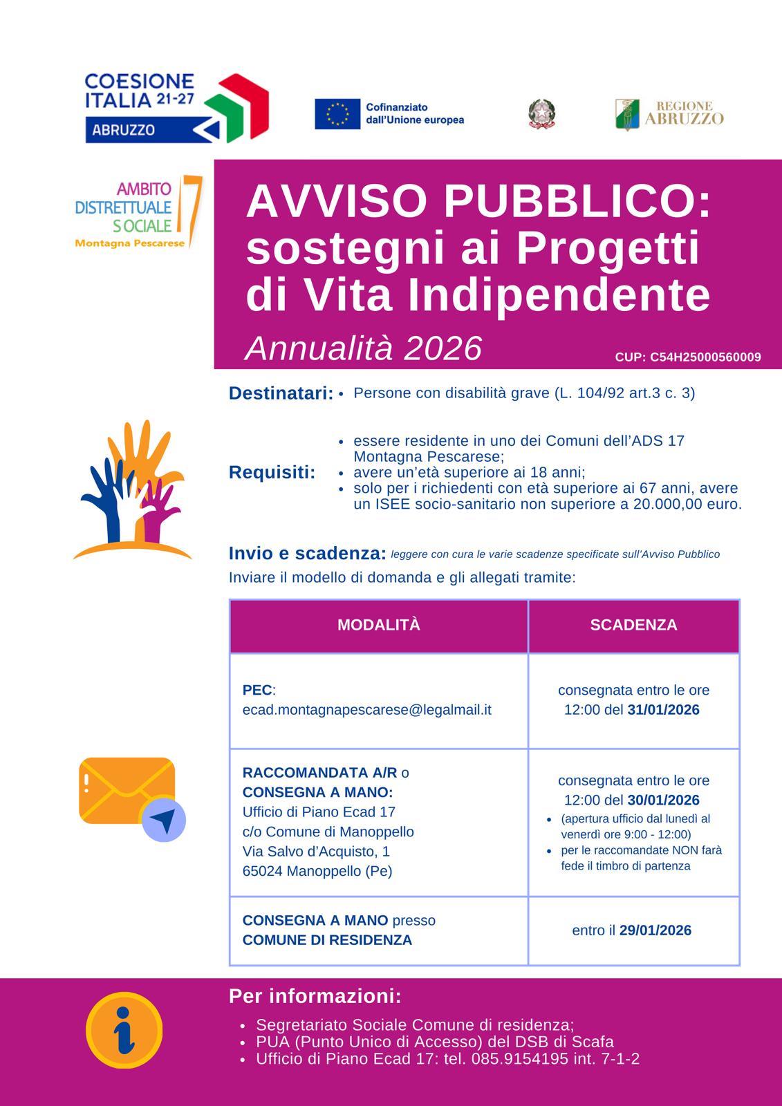 Si informa la cittadinanza che è stato pubblicato l'AVVISO PUBBLICO, avente ad oggetto "Legge Regionale n. 57/2012 - Interventi Regionali per la Vita Indipendente - Annualità 2026".