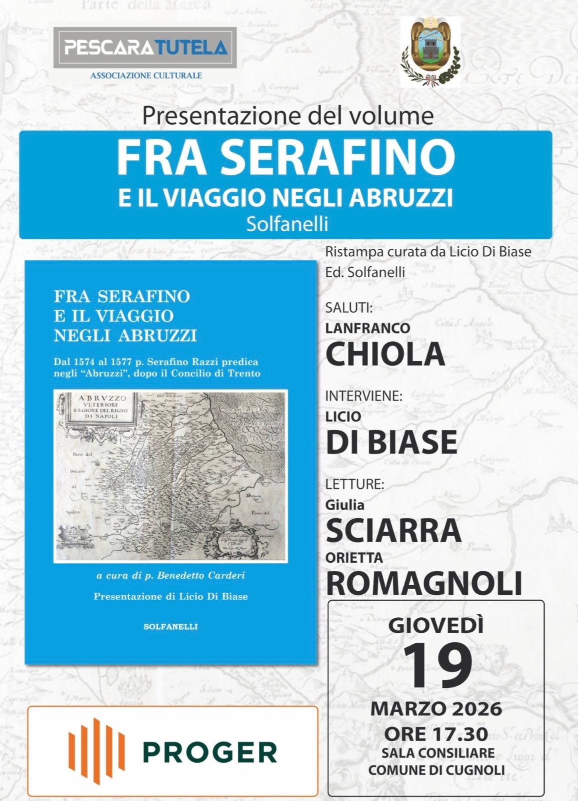 Si invita a partecipare alla presentazione del volume "FRA SERAFINO E IL VIAGGIO NEGLI ABRUZZI" Dal 1574 al 1577 P. Serafino Razzi predica negli "Abruzzi", dopo il Concilio di Trento che si terrà giovedì 19 marzo 2026 - alle ore 17:30 presso la Sala Consiliare del Comune di Cugnoli.